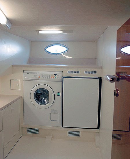За салоном на небольшом возвышении в две ступеньки раковина, четырехкомфорочная электроплита, гриль, микроволновая печь, холодильник с морозильной камерой, посудомоечная машина и вытяжная вентиляция. Сюда же необходимо приплюсовать вместительные выдвижные ящики и противопожарную систему. Стандартная комплектация кухни вряд ли вызовет нарекания, к тому же она сообщается с хозяйственным отсеком, где находятся, стиральная машина, сушильный шкаф и откидная гладильная доска.