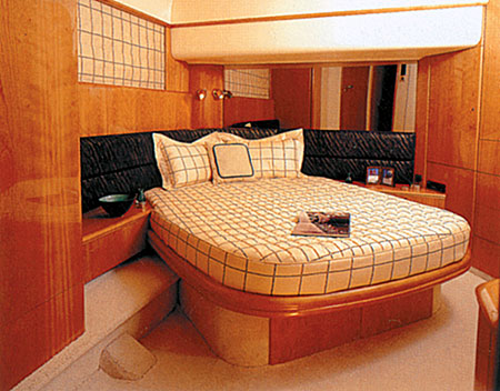 Всего на яхте пять кают для отдыха. Одна из них находится под кокпитом, рядом с машинным отделением, и предназначена для команды. Другая расположена в корме, под столовой зоной салона, рядом с хозяйскими апартаментами. Эта каюта может использоваться либо как дополнительное складское или бытовое помещение, либо как спальня для обслуживающего персонала, либо как еще одна гостевая спальня. Две другие гостевые каюты, более презентабельные, находятся поблизости от мастер-каюты. Вообще говоря, на этом судне выбор мастер-каюты зависит от личного предпочтения хозяина. Каждая из кают оснащена туалетной комнатой с отдельным входом. Одна из спален расположена в носовой части кормы, другая – по правому борту. Большая двуспальная кровать округлой формы вписана в пространство каюты таким образом, что справа и слева от нее достаточно свободного места, чтобы ощутить себя в полноценной спальне со встроенными платяными шкафами из красного дерева и такой же обшивкой стен. Справа и слева от кровати размещены прикроватные тумбочки, представляющие собой вытянутые по горизонтали навесные полочки, изготовленные также из красного дерева. Расположенные в ритме ступеней от пола к иллюминатору, они играют роль связующего звена между всеми элементами обстановки в каюте.
