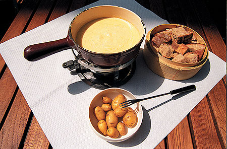 Главное национальное швейцарское блюдо – фондю. В старину швейцарцы вечером возвращались после тяжелой работы домой, растапливали сыр, макали в него куски хлеба и быстро насыщались. Фондю – очень экономное блюдо, пожалуй, при равном количестве ингредиентов оно даже выгоднее пиццы – пищи бедняков Италии. Сейчас в Швейцарии бедных не осталось, а фондю все равно готовят, причем каждый повар по-своему. Вот рецепт от повара ресторана Cafe de Grutli в историческом центре Лозанны.