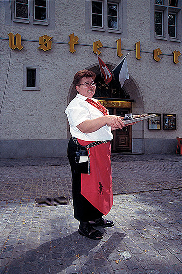 • «мясо на шпаге» – обернутые вокруг толстого вертела куски говядины, лучше всего это блюдо готовят в цюрихском ресторане Zeughauskeller («Цойхгаускеллер» – старый арсенал в Гассене);