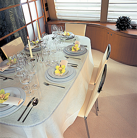 Одной из главных особенностей этой яхты называют почти полную симметричность ее помещений, что ранее не встречалось на лодках такого класса. Впрочем, на мой взгляд, это не главное. В конце концов, если вам нравится ваш дом, какая разница – симметричен он или нет. Хотя факт, конечно, примечательный. На это сразу обращаешь внимание, едва успев подняться по телескопическому тиковому трапу и оказавшись в кормовом кокпите – ровно посередине там расположен овальный стол. Впечатление зеркальности становится абсолютным в лаунж-зоне салона: по правому и левому бортам расположены два одинаковых кресла, диваны-близнецы и самое необычное – пара журнальных столиков со стеклянными столешницами. Доминантой служит огромный плазменный экран, расположенный прямо напротив входа в салон и, как нетрудно догадаться, ровно посередине. Огромные иллюминаторы наполняют это помещение дневным светом. Если же вам нравится полумрак – просто опустите жалюзи. За «спиной» телевизора – легкая сдвижная ширма в японском духе. Эта деталь сейчас весьма актуальна в дизайне суперъяхт, поскольку позволяет «программировать» пространство – разделять различные по назначению зоны, при этом, не изолируя их полностью.