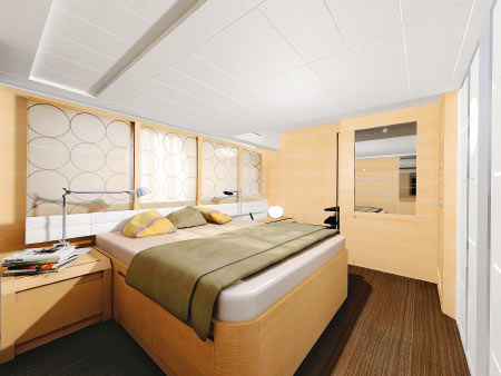 В мастер-каюте, расположенной в центре корпуса, предусмотрены огромные, частично открывающиеся иллюминаторы, а из деталей интерьера хотелось бы особенно выделить несколько виртуозно исполненных шедевров опять же от Poltrona Frau: стол, изголовье кровати и поручни, обтянутые натуральной кожей. При планировании нижней палубы можно выбирать из двух вариантов. Если предполагается, что на борту соберется большая компания, есть смысл устроить три каюты для гостей (одна с кроватью king size в носовой части яхты и две с раздельными спальными местами ближе к центру корпуса). В качестве альтернативы предлагается две каюты и дополнительный уютный салон.