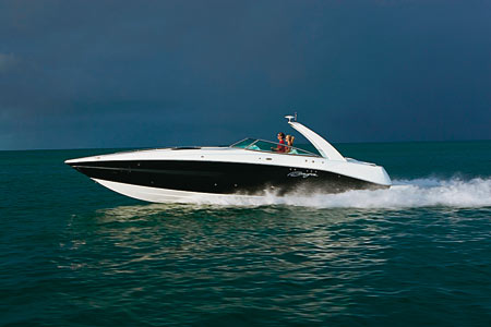 Новый подход продемонстрирован также в интерьере и планировке. Поэтому 405 Performance смотрится несокрушимо во всех ракурсах. Лодка оснащена системой раздельного управления двигателями и великолепно подходит как для высокоскоростных круизов, так и для заездов Poker Runs. На первый взгляд этот 39-футовый болид весом более 5 тонн не кажется слишком мощным с двумя двигателями MerCruiser 496 Magnum по 375 л.с. Однако лодка выходит на глиссирование за 5,7 секунды и в течение 20 секунд разгоняется до предельной скорости в 60,3 миль/ч. Покупатели, жаждущие большей скорости, могут заменить стандартный двигатель на опциональный мощностью в 525 л.с. от Mercury Racing. Тип топлива — на выбор: бензин или дизель; запас горючего — 870 л. Тем, кто считает, что такие лодки созданы только для гладкой волны, будет интересно ознакомиться с тестами: на скорости свыше 50 миль/ч 405 Performance утюжила волны и не трещала, «моля о пощаде», а двери в каюту были плотно закрыты и даже не пытались открыться. Управление отлично подчиняется движениям руля, который с ростом скорости немного тяжелеет.