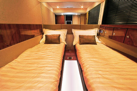 Две гостевые каюты на новой Fairline Squadron 55 нисколько не жертвуют комфортом гостей ради удобства владельца яхты. Носовая каюта впечатляет необычно большими люками над двуспальной кроватью, а во второй гостевой установлены две отдельные кровати полноценной длины, а не какие-нибудь «детские» полки.