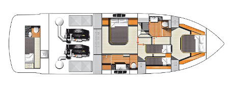 Организация жизненного пространства на Squadron 55 вполне способна составить конкуренцию лодкам классом выше. На борту даже предусмотрена кормовая каюта для шкипера (если нет необходимости нанимать шкипера, здесь можно устроить вместительную кладовую). Впрочем, известно, что наличие помещения для экипажа еще не означает, что вам будет комфортно уживаться на борту. С этой точки зрения комфорт скорее обеспечивают удобные проходы к ключевым местам — посту управления, кухне, моторному отсеку. В этом смысле задача планировки Squadron 55 решена на пять баллов: пассажиры могут с комфортом отдыхать, шкипер — спокойно работать.