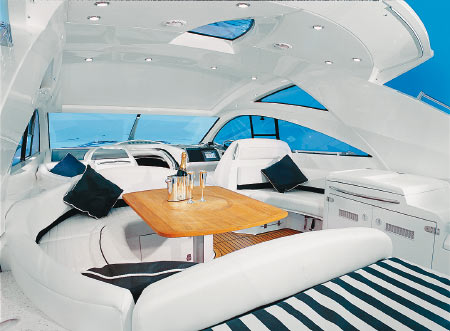 Обновления коснулись в основном интерьера — проверенная временем планировка осталась без принципиальных изменений. Впрочем, в кокпите поменяли размер, дизайн и «начинку» бара: раньше это была компактная стойка с холодильником, раковиной и изолированным термобоксом. В новой версии для бара выделили гораздо больше места (убрав сиденье за постом управления), так что теперь он превратился практически в полноценный камбуз со всей вышеперечисленной техникой, большой рабочей поверхностью, шкафами и возможностью опциональной установки дополнительного оборудования — льдогенератора и гриля. Расположенная напротив обеденная зона была просторной и раньше: удобный U-образный диван и солидный стол, складывающийся вдвое, чтобы не затруднять передвижение по кокпиту во внеобеденное время. Стол предложен в новом варианте, однако старый «сюрприз» остался: с обратной стороны его откидного «крыла» — удобные держатели для напитков. Солярий трогать не стали — уж слишком удачным было прежнее решение: пара лежаков разного размера, а между ними удобный широкий проход на кормовую платформу, отделанную тиком уже в стандартной комплектации. Под большим лежаком левого борта — вместительный гараж для тендера с электроприводной дверью.