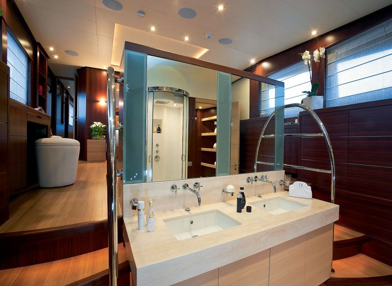Таким образом, получается весьма остроумно организованное пространство, позволяющее максимально эффективно задействовать каждый сантиметр носовой части судна. К слову, в восьмом корпусе у этой каюты появился отдельный вход с левого борта. В целом разработчики интерьера сохранили стандартную для 120-й серии планировку жилых помещений. На нижней палубе в зеркальной симметрии расположены четыре гостевые каюты, выдержанные в единой гамме и оснащенные абсолютно идентично, поэтому проблем с уязвленным самолюбием у гостей не возникнет. В их распоряжении выход в Интернет, спутниковое TV, аудио- и видеосистемы, доступ к мультимедийному серверу яхты, в памяти которого можно хранить 2500 CD- или 100 DVD-дисков.