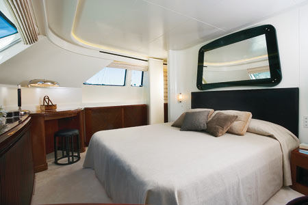 Если двигаться по основной палубе из столовой к носу, оказываешься в просторном фойе. Уникальная деталь планировки Sanlorenzo SD92 — распашные стеклянные двери, ведущие из фойе на палубу. Таким образом, из фойе можно осматривать яхту сразу в трех направлениях: пройти ближе к носу в мастер-каюту, спуститься на нижнюю палубу в каюты гостей или выйти на палубу. Владельцу на борту Coco отдана жилая площадь, объемом равная салону. Просторная ванная комната, отделанная мрамором оттенка «ирландская зелень», с зонами «для нее» и «для него», служит отличной шумопоглощаюшей прослойкой между общественными помещениями и каютой владельца. Пожалуй, настолько просторная ванная комната сокращает жилую площадь каюты, но опять же помните: когда речь идет о яхте Sanlorenzo, любой рассказ стоит воспринимать лишь как пример возможностей верфи. Пусть спальня и кабинет мастер-каюты на яхте Coco не ошеломляют площадью, но они точно поразят вас видом на море через сплошное стекло в носовой части яхты. По правому борту в мастер-каюте спланирован скрытый от глаз гардероб. Как и салон-столовая, мастер-каюта обставлена мебелью и дополнена мелочами 1930–40-х годов из коллекции владельца.