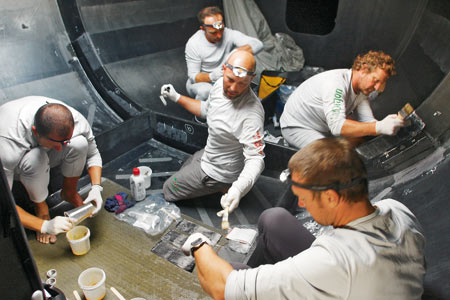 А пока Telefonica Blue продолжала укреплять превосходство. Но и на борту лидера все шло не гладко. Шкипер команды Боуи Беккинг повредил спину и сутки не вставал с койки, продолжая оттуда руководить командой. Команда зафиксировала ветер в 55 узлов, прежде чем с мачты сорвало анемометр.