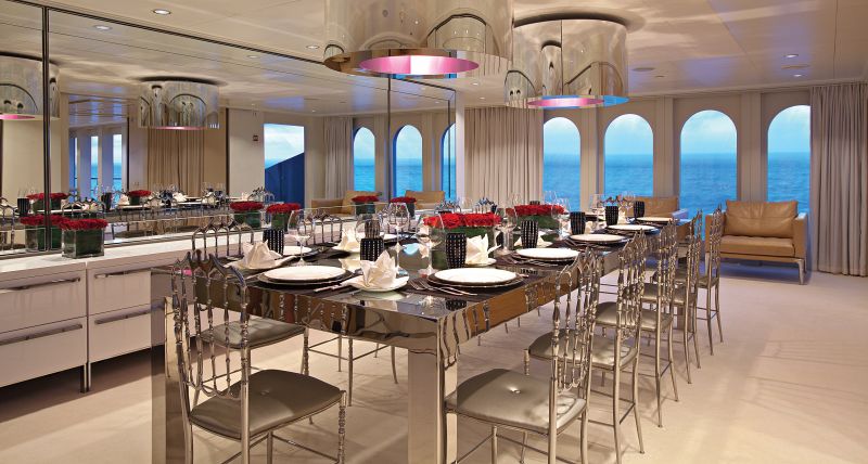 Формальные детали в Diamond A уживаются с неформальными. Примером такого симбиоза служит обеденная зона в главном салоне, где над классическим лакированным столом — люстра в стиле минимализм.