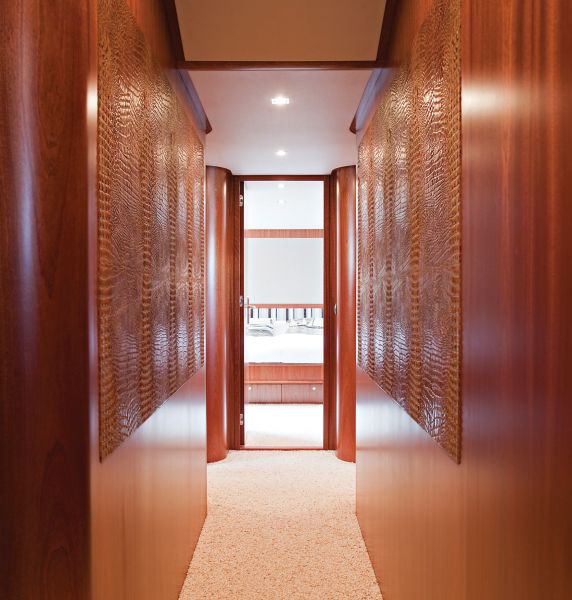 В просторном основном салоне много естественного света благодаря большим прямоугольным окнам и зеркалу, расположенному напротив входа. Салон разделен на удобные и функциональные «островки»: лаундж и обеденную зону, в которой могут разместиться восемь гостей. При оформлении салона использовались традиционные материалы, но благодаря простору, естественному свету и отсутствию лишних деталей он выглядит очень современным. В носовой части главной палубы — камбуз и рулевая рубка, в которой все сделано для удобства управления. Здесь хватит места и для капитана, и для любопытных гостей, пришедших понаблюдать за процессом управления судном. Гостевые каюты расположены внизу. Мастер-каюта во всю ширину корпуса имеет отдельную ванную комнату и вместительную гардеробную. Три иллюминатора по каждому борту наполняют помещение дневным светом. В носовой части — VIP-суит. Справа и слева — две гостевые каюты с собственными ванными комнатами. Четыре члена команды могут разместиться в двух каютах. Тендер и гидроциклы хранятся в кормовом гараже с большой гидравлической дверью. Такое решение помогло сделать флайбридж, где на всех предыдущих моделях этой серии находился тендер, существенно просторнее. Интересно, что на Mulder Flybridge 92 — самый большой флайбридж из всех моделей Mulder. Здесь расположены лаундж, джакузи, бар с холодильником, раковиной и грилем. Половина флайбриджа отведена под зону для принятия солнечных ванн. Два двигателя Caterpillar мощностью 1015 л. с. позволяют яхте развивать максимальную скорость 18 узлов и гарантируют внушительную для таких размеров судна круизную скорость 16 узлов. Конструкция корпуса гарантирует прекрасные мореходные качества при любых погодных условиях. Благодаря большому топливному баку в 18 000 литров Mulder 92 Flybridge может пройти 3400 миль со скоростью 10 узлов.
