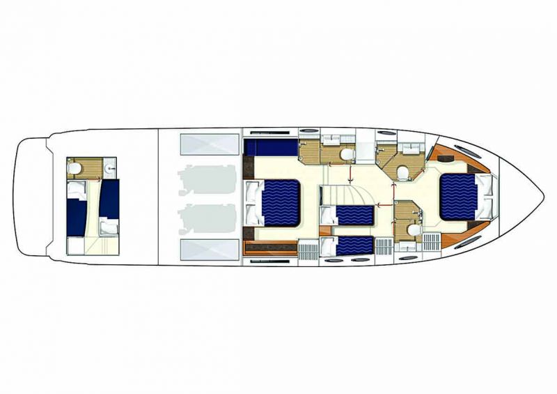 Мастер-суит новой Princess 60, сделанный во всю ширину корпуса, очень светлый и высокий. Здесь установлены жидкокристаллический телевизор с DVD-проигрывателем и встроенная аудиосистема. VIP-каюта в носовой части корпуса укомплектована большой кроватью, а в двухместной гостевой каюте не возникает ощущения скованности. Все три каюты оснащены отдельными санузлами с душевыми.