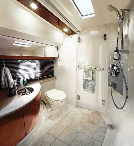 Обо всем по порядку. Начать стоит с флайбриджа — места, где владелец и гости больше всего проводят времени в хорошую погоду. Модель оснащена стандартным хардтопом из стекловолокна, который можно наглухо закрыть тентом, образовав таким образом своего рода всепогодный скайлаундж. При желании вместо хардтопа можно установить радарную арку, правда в таком случае потеряется одна из важных особенностей этой модели — раздвижная брезентовая крыша хардтопа. Такому многофункциональному флайбриджу могут позавидовать многие спортивные круизеры. Кроме поста управления здесь находятся стол из красного дерева (за которым, кстати, уместится больше людей, чем кажется с первого взгляда), диван в форме подковы и холодильник для напитков.