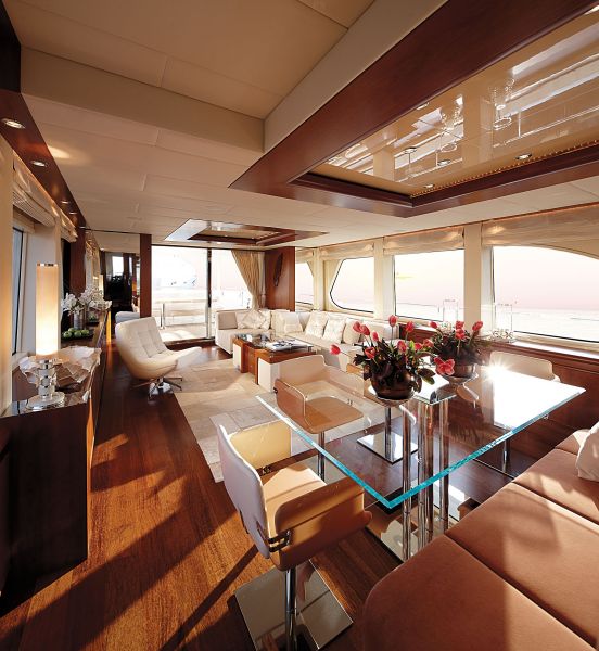 Флайбриджный Canados 120 Far Away — дебютант выставки и флагман верфи. До этого самым большим судном было 116-футовое. Планировка и интерьер 36-метровой яхты от Francesco Paszkowski почти полностью кастомные. В отделке использованы дуб, эбеновое дерево, натуральный камень, титан. Доминирует серый цвет. Музыка на палубах, кондиционеры и свет регулируются инновационной системой управления с использованием iPad. Яхта рассчитана на 8 гостей. Благодаря широким окнам на корпусе во всех каютах на нижней палубе очень светло: и в мастер-каюте, и в VIP, и в трех гостевых. На основной палубе также просторно: L-образный диван в салоне вмещает до 10 человек, салон в любой момент может за счет террас с гидравлическим управлением объединиться с открытой палубой.