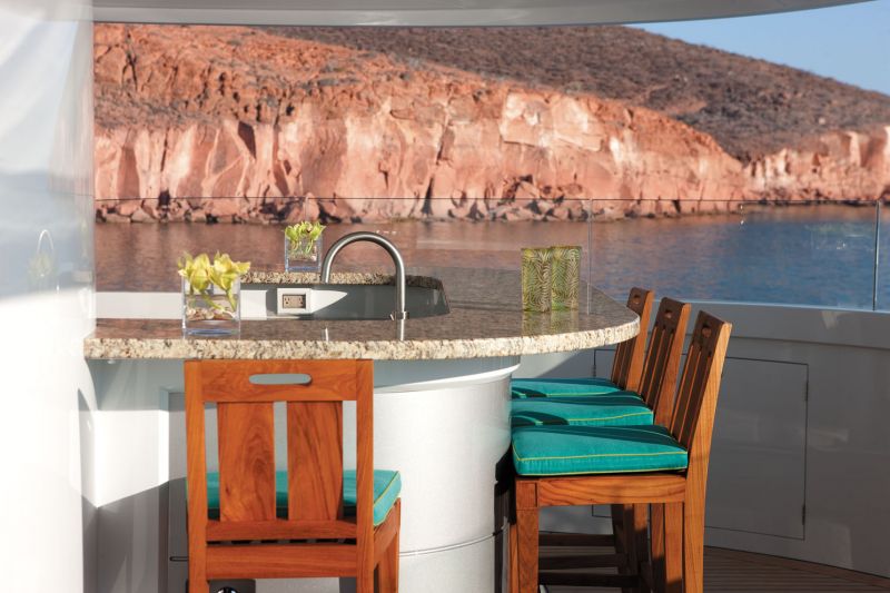 У Arianna есть и открытые зоны, которые заслуживают внимания. Одна из них — терраса в корме главной палубы для обедов alfresco. Также сандек, оборудованный джакузи, диваном и обеденным столом в тени радарной арки, баром и шезлонгами. Если солнце станет нестерпимым, можно воспользоваться карбоновым бимини-тентом. В любом случае каждый из гостей сможет найти в этом воссозданном полинезийском раю свой персональный оазис.
