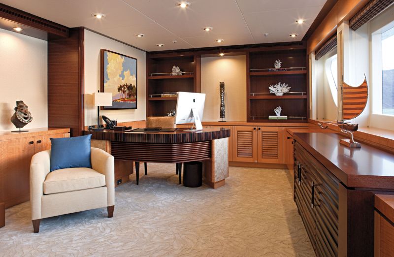 Из салона есть выход в отдельную комнату для детей или других близких членов семьи. В результате получилось очень уютное убежище, из которого открывается прекрасный панорамный вид на море. В том месте, где традиционно располагается мастер-суит — передняя часть главной палубы, — конструкторы разместили тренажерный зал с сауной и личный кабинет владельца, для которого на борт специально подняли необычный винтажный сейф немецкой работы.