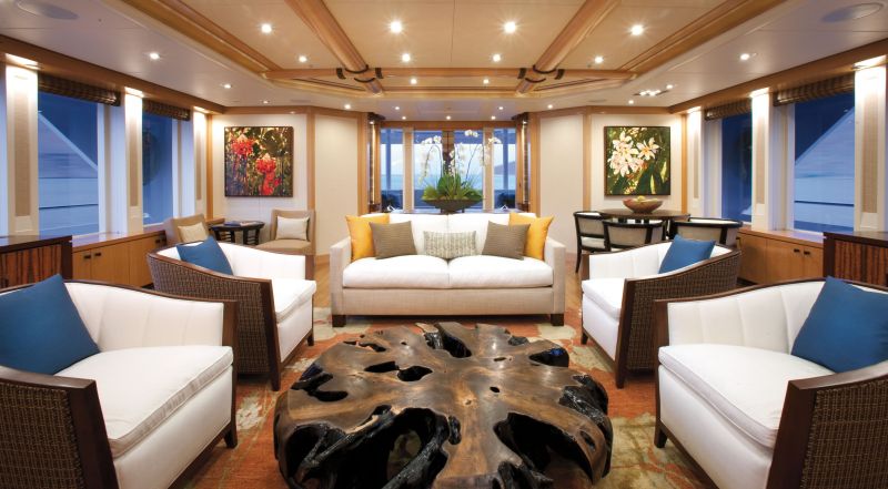 Bнутреннее дизайнерское подразделение верфи Delta Design Group реализовало пожелание владельца — у яхты появился интерьер в полинезийском стиле, но не диковинный, а элегантный, комфортабельный и удобный для путешествий всей семьей. Это настоящий особняк на воде, где все элементы складываются в затейливую мозаику фактур. Для отделки использованы ценные тропические породы дерева, такие как эбеновое дерево, венге и экзотическая древесина Коа, а также массив красных пород бубинга и махагона.