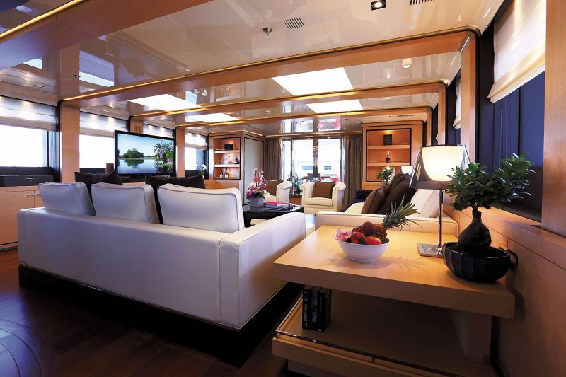 Основной салон яхты традиционно размещен на главной палубе. Его цветовая гамма — натуральная, спокойная и размеренная, преобладающий белый тон смешивается с кремовым, бежевым и коричневым. Мягкое и равномерно распределенное освещение (искусственное — из ламп на потолке, естественное — из огромных окон) создает расслабленную и теплую атмосферу. В кормовой части салона имеется C-образный лаундж с белыми диванами и полукруглыми креслами. Эта зона легко превращается в кинотеатр.