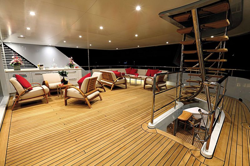 Верхний салон 2 Ladies — воздушный и неформальный. Помещение отделано орехом, ясенем, эбеновым деревом, а потолок украшен лакированными подсвеченными панелями. Салон состоит из двух мини-лаунджей с диванами и кофейными столиками. Еще пара лаунджей находится на этой же палубе — на свежем воздухе, причем один из них, расположенный в носовой части судна, представляет собой полноценную обзорную площадку с великолепными видами. На сандеке яхты имеется внушительных размеров зона для принятия солнечных ванн с комфортабельными лежаками, большое джакузи, полноценный L-образный бар и гриль-барбекю. При этом владельцы отказались от дополнительной обеденной зоны на открытом воздухе, ограничившись только одной — в кормовой части главной палубы.