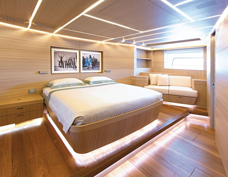 «Большая часть мебели создана штатными мастерами Fitzroy Yachts, — говорит управляющий директор верфи Родни Мартин. — Изогнутый диван, кресло в кабинете владельца и обеденные стулья — от Cassina. Матрасы изготовлены новозеландской фирмой Dreamwool из шерсти и латекса по индивидуальному заказу. Выбором текстиля занималась жена владельца, которая работает в этом бизнесе».