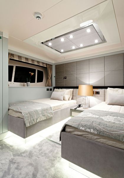 Интерьер яхты получился свежим, элегантным и спокойным. Матовая естественная окраска стен оживает благодаря правильным акцентам в виде полос из перламутра и нержавеющей стали, а базовую палитру нежно-голубого и серого разбавляют то нежно-розовый, то насыщенный темно-синий, то благородная древесина венге. «Это очень богатый, глубокий, сбалансированный интерьер, выполненный с невероятным вниманием к деталям», — комментирует директор по маркетингу и коммуникациям Sunseeker Майлс Мурхаус.