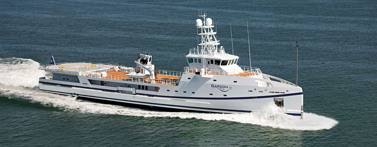 Правда, это судно не просто рабочая лошадка. Много труда было вложено и в ее оформление. Капитанский мостик спроектирован по всем канонам яхтенной индустрии, оснащен серьезной системой контроля и наблюдения. Скошенные окна рубки — элемент дизайна, пришедший из коммерческого флота и экспедиционных судов, как нельзя к месту на Sea Axe. Владелец Garçon решил не устанавливать систему Dynamic Positioning, но она идет как дополнительная опция и была бы на Garçon очень кстати, учитывая что нужно постоянно маневрировать в непосредственной близости от основной яхты.