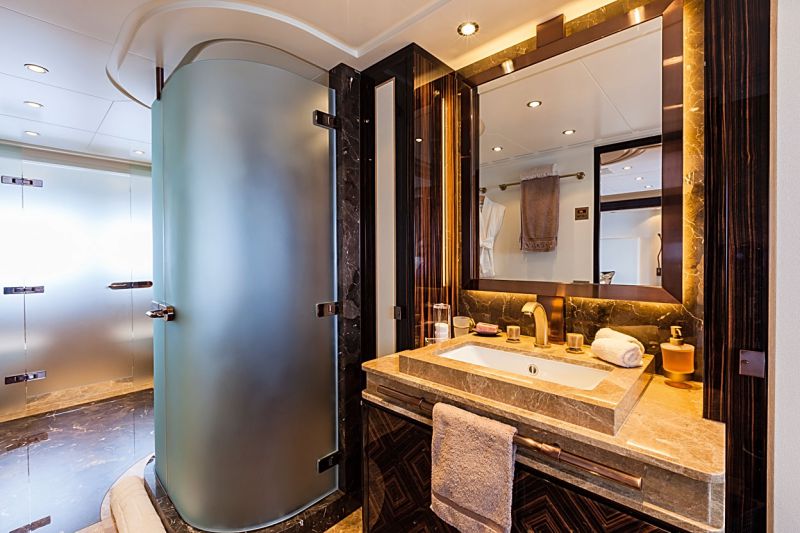 Десять гостей размещаются в пяти каютах — мастер-каюте во всю ширину яхты на главной палубе, двух VIP-каютах тоже во всю ширину корпуса и двух гостевых каютах с раздельными кроватями на нижней палубе. Все каюты оборудованы отделанными мрамором ванными комнатами. Каждая каюта выполнена в индивидуальной цветовой гамме в рамках общего стиля.