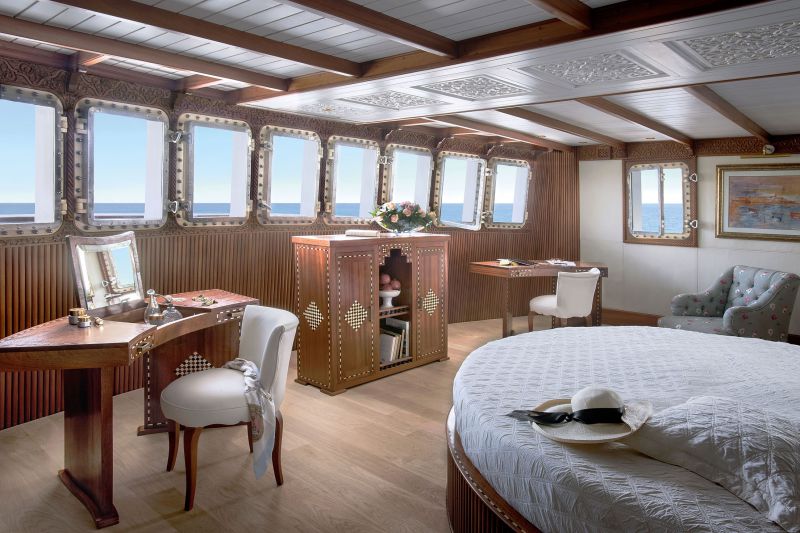 Яхта располагает шестью палубами, семью каютами, расположенными на главной, верхней и посадочной палубах. Это мастер-каюта Armateur площадью 66 кв. м, две каюты Deluxe Suite 36 ,кв. м и четыре каюты Prestige 22 кв. м. Все каюты — с кроватями king size, телевизором, DVD-плеером, док-станцией для iPod, туалетным столиком, ванной комнатой с душем и ванной, отдельным туалетом и отделкой из мрамора и оникса. Armateur также включает в себя гостиную-офис.