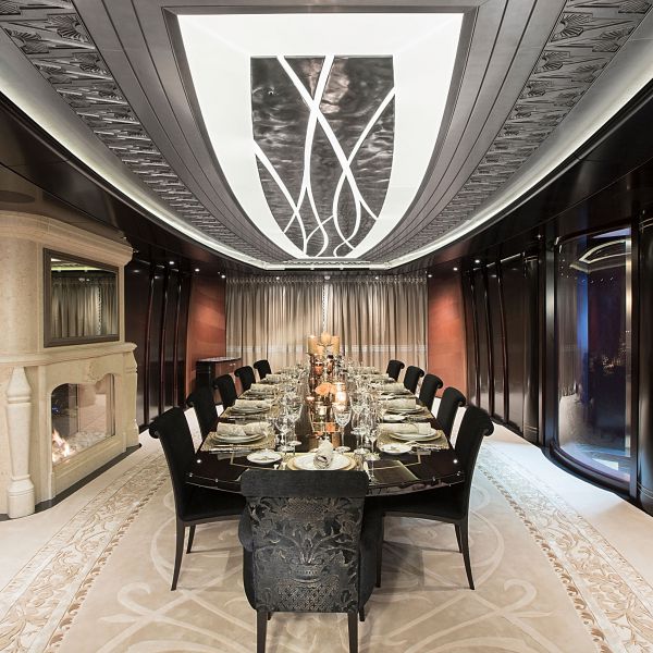 Салон на главной палубе более формальный. Здесь имеются лаундж с баром, внутренний кинотеатр, сигарная комната, камин и оригинальное вытянутое фортепиано, отделанное медью. Поднявшись по лестнице, гости попадают в менее официальное пространство с еще одним лаунджем и обеденной зоной на 18 персон. В кормовой части верхней палубы еще одно особенное изобретение дизайнеров — зимний сад. Еще один обеденный стол, защищенный от любой непогоды и ветра стеклянными щитами. Мостиковая палуба с баром предназначена для дискотек — танцпол удваивается в размере, если использовать для танцев вертолетную площадку.