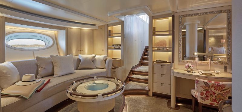Элегантный интерьер Elfje — заслуга дизайн-бюро Redman Whiteley Dixon. Жилые помещения, выдержанные в светлых тонах гаммы «кофе с молоком», удивительно просторны и наполнены естественным светом. Вся мебель, разумеется, кастомная. В аксессуарах и отделке — будь то «старомодная» форма настольных ламп, стеганые одеяла или гитара, висящая на переборке, — чувствуется отсыл к тем временам, когда большие яхты действительно были настоящим домом для своих владельцев, которые решили отправиться под парусом навстречу приключениям. Столик oculus в мастер-каюте, представляющий собой донный иллюминатор, сквозь который можно наблюдать за обитателями моря (особенно эффектно это выглядит ночью при включенной подводной подсветке), вполне вписывается в эту концепцию.