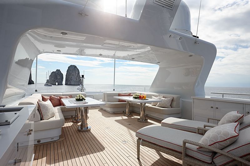 Владельцы хотели заниматься спортом на борту и высказали идею, что было бы неплохо иметь инновационный бассейн на 9000 литров воды с противотоком и переливом на корме. Вписать такую «фишку» в 44 метра — задача не из легких. И все же Feadship это оказалось под силу — да еще как! Инженеры придумали специальную конструкцию палубы, одна из секций которой опускается, чтобы бассейн имел достаточную глубину. Он наполняется водой за 20 минут, после чего можно включать противоток и плавать. А так как владельцы часто путешествуют в семейном кругу, был создан еще один механизм, с помощью которого на палубе создается неглубокий бассейн для детей — его еще можно использовать как джакузи. Стоит нажать кнопку, и бассейн закрывается, а кормовая часть главной палубы превращается в большую обеденную зону на свежем воздухе.