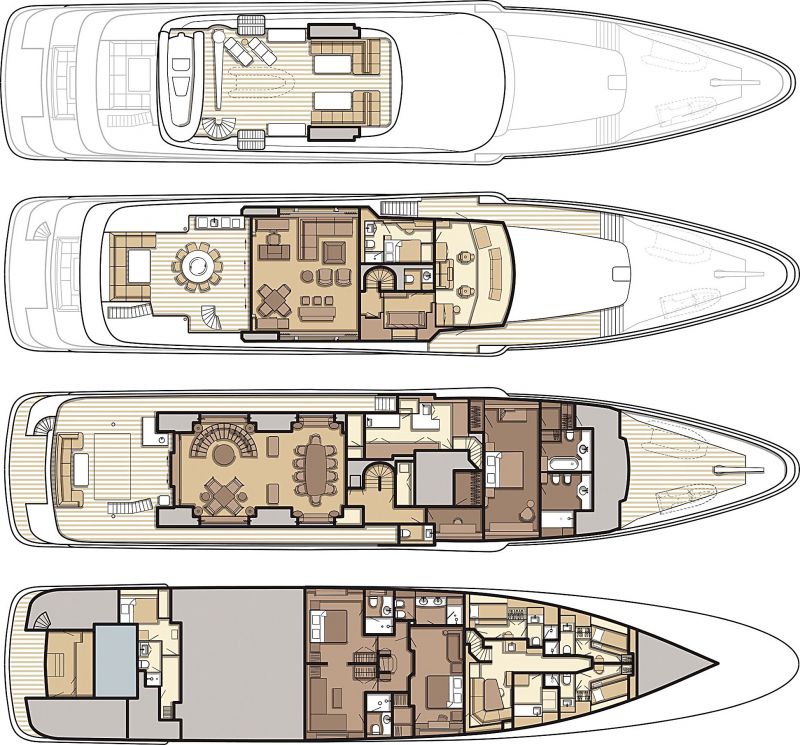 В целом планировка Moon Sand весьма традиционная, однако есть и свои нюансы. Любовь владельцев к настольным играм и веселому досугу в большой компании гостей выразилась в наличии соответствующих зон как в верхнем неформальном салоне, так и в салоне на главной палубе.