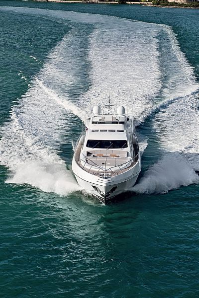 Во-первых, яхта оборудована такими же двигателями и водометами, как на более крупных моделях верфи: двумя дизелями MTU 16V 2000 M94 мощностью 2600 л. с. каждый и парой водометов KaMeWa 56 S3. Они обеспечивают максимальную скорость 36 узлов.