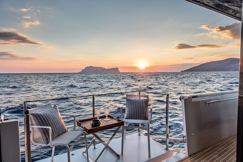 На корме главной палубы – открытая площадка длиной почти девять метров. Кокпит с еще одним обеденным столом alfresco укрывается от солнца в тени надстройки. По бортам оборудованы откидные балконы. Они идеальны, чтобы уединиться и любоваться закатом с бокалом вина и закусками, паря в считанных метрах над морем. Дальше – диваны и лежаки в огромном лаундже, его также можно закрыть от солнца пляжными зонтиками. Oни спрятаны и ждут своего часа в специальных пазах. Дизайнеры и инженеры Arcadia к тому же предусмотрели интересную обзорную площадку на носу с отдельным входом с палубы. Это приватная комната с U-образным диваном, широкими окнами и превосходным видом при движении яхты.
