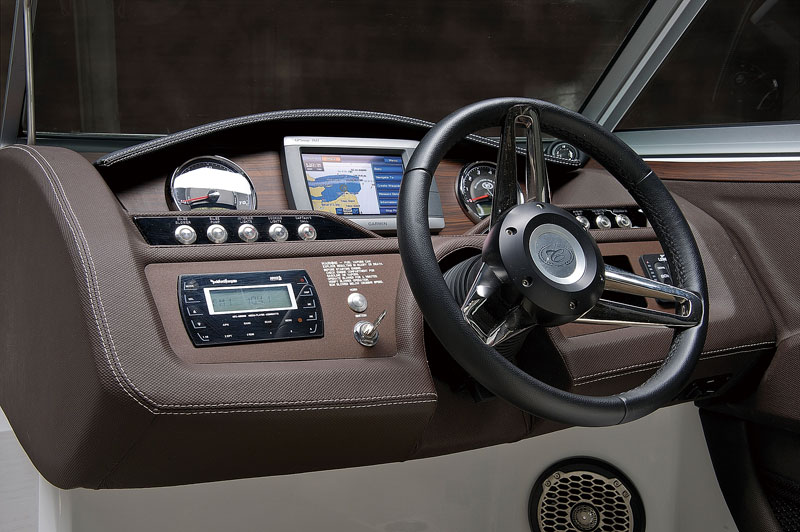 Все три модели столь же комфортны и практичны, сколь и спортивны. Эргономике и качеству поста управления уделено максимум внимания, ведь Cobalt покупают, чтобы управлять им самостоятельно. Приборная панель отделана винилом и алькантарой. Аналоговые приборы можно заменить на два экрана Garmin, на которые можно вывести любую нужную информацию.