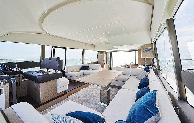 Премьеру своего нового флагмана Prestige Yachts приурочила к сентябрьской выставке в Каннах. Модель с индексом 590, возглавляющая линейку флайбриджных яхт, отличается сочетанием строгих классических форм и модных современных трендов в дизайне. При длине лодки 18,7 м на борту уместилось три гостевые каюты, и как вариант планировки есть ещё возможность выбора: обустроить дополнительную четвертую каюту для персонала или гараж для риба. В моторном отсеке стоят спаренные 600-сильные дизели Cummins QSC с приводами Zeus. Заявлены максимальная скорость 29 узлов и крейсерская 23 узла, дальность хода не приводится, однако топливные танки рассчитаны на 2200 литров.