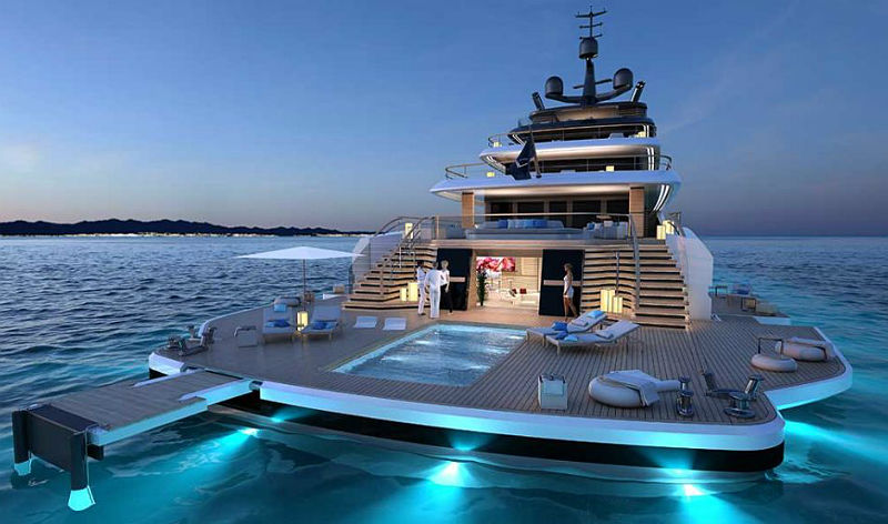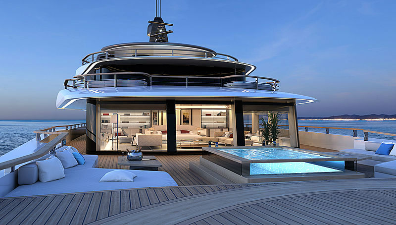 Зонирование в этом концепте яхты от Nauta выполнено так, что владелец получает в своё распоряжение вверхнюю палубу с мастер-апаратаментами, салоном, вертолётной площадкой и лаунж-зоной с джакузи, а гости – гигантский пляжный клуб на корме.