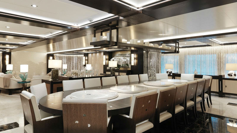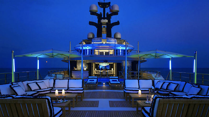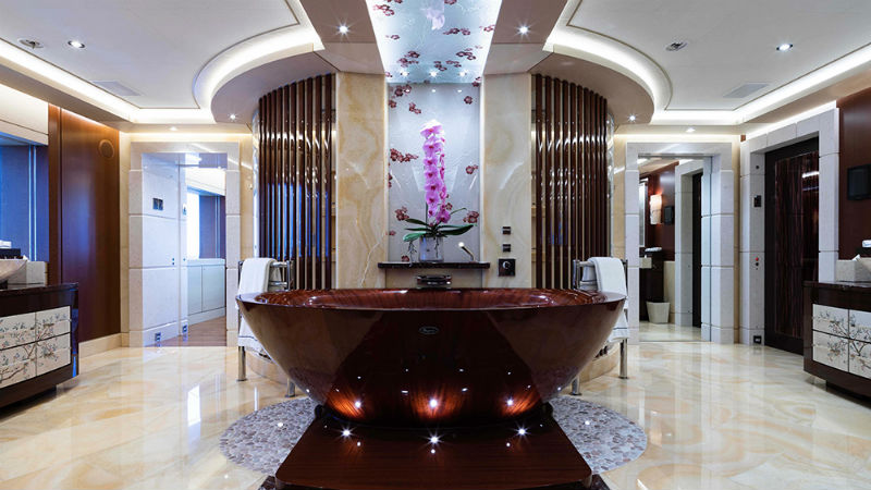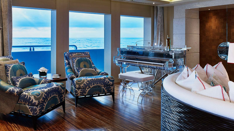Наслаждаться жизнью можно в бассейнах с джакузи, хаммаме и сауне. На палубу выходит спортзал с массажным столом и спа-салоном. В главном салоне внимание привлекает прозрачный рояль. На яхте есть даже стеклянный лифт.