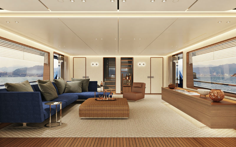 Запатентованная верфью транцевая система DTM позволит использовать откидную дверь гаража в качестве пляжного клуба. Если же нужно будет спустить тендер на воду, то она погрузится под воду для более лёгкого спуска лодки.