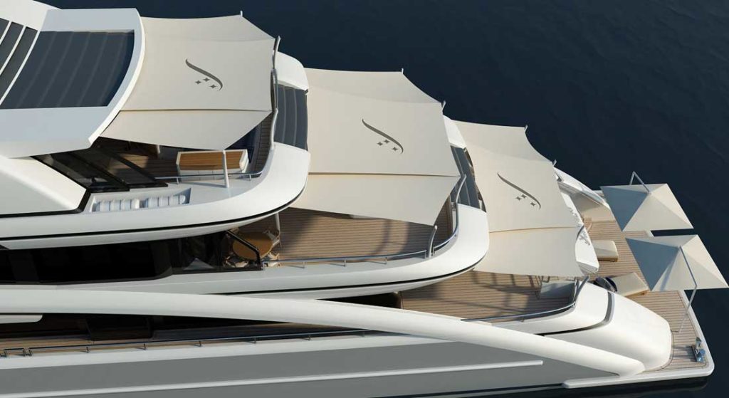 Судя по опубликованному рендеру главного салона, интерьеры яхты будут близки к современному прочтению стиля ар деко. В основе цветовой гаммы – приглушённые белые оттенки потолка, стен и пола. Колористический минимализм компенсируют стеновые панели и молдинги из экзотических пород дерева, в основном, венге, латунные окантовки и фурнитура.