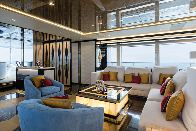 Боковые панели при входе в салон украшены инкрустацией из дуба, золотистого стекла и голубой кожи. Стойка бара изготовлена из великолепного белого оникса и обшита белой кожей с ромбовидной прострочкой. Лаундж-зона состоит из большого L-образного белого дивана с кофейным столиком из подсвеченного оникса и черного дерева и двух светло-голубых кресел, обшитых нубуком. Обеденный стол на 12 персон украшен вставками из мрамора Azul Macaubas и золотистого стекла. Еще больше элегантности интерьеру добавляют вставки из меди на потолке и некоторых предметах мебели.