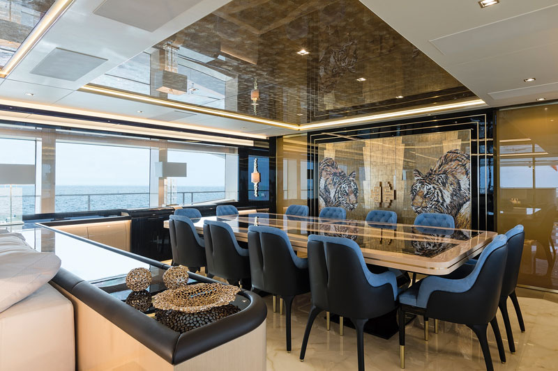 В салоне главной палубы взгляд немедленно приковывается к полу, представляющему собой контрастную шахматную доску из мраморных и золотистых восьмиугольников. Белый оникс образует «ковер» в главной обеденной зоне. Стена в этой зоне облицована роскошной цветной мозаикой с изображением двух крадущихся тигров.