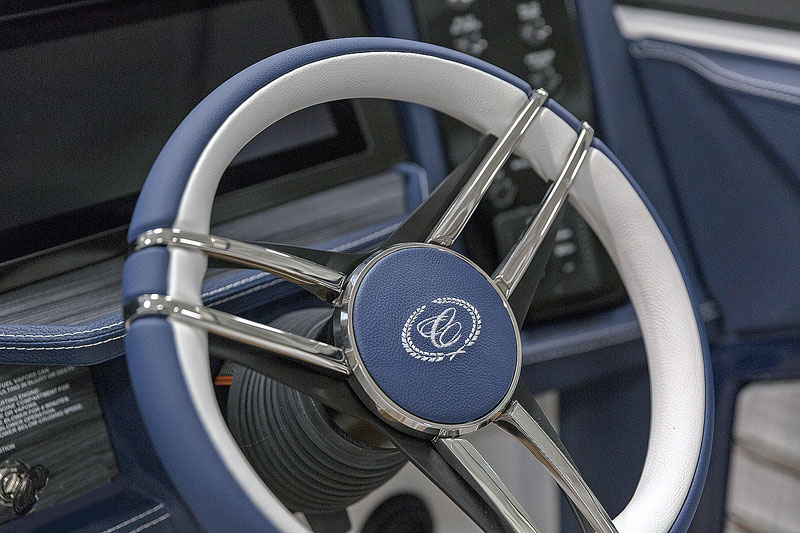Особенно хочется отметить новую приборную панель. Она стала полностью цифровой, на большой дисплей выводится вся информация о вашем катере. Штурвал обтянут натуральной кожей с вышитым логотипом Cobalt по центру.