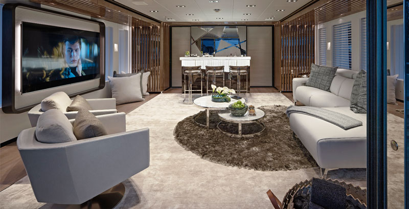 На мостиковой палубе находится верхний салон, к которому примыкает обеденная зона на открытом воздухе. Это наиболее популярное место пребывания гостей на яхте, поэтому здесь предусмотрена большая сервировочная зона, сообщающаяся с камбузом посредством кухонного лифта. В салоне имеются телеэкран с диагональю 75 дюймов и барная стойка из оникса с подсветкой. Любопытно, что столы на открытых палубах яхты изготовлены известным производителем кресел для трофейной рыбалки.