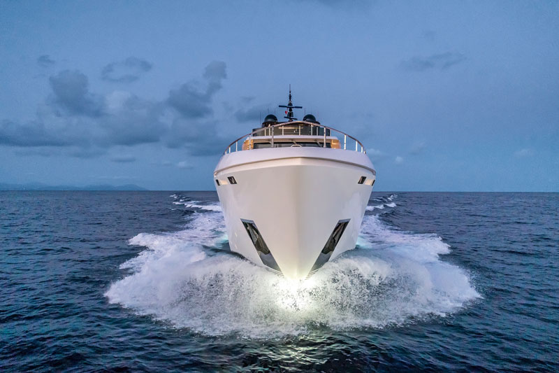 Не меньше, чем красотой, флагман Custom Line впечатляет техническими инновациями – в первую очередь, непревзойденной звукоизоляцией. Помимо современных изоляционных материалов в переборках, на яхте используется «плавающий» пол. Между ним и фиберглассом корпуса находится слой звукоизолирующего материала, благодаря чему до гостевых зон не доходят ни трансмиссионные шумы, ни звуки шагов, ни разговоры в соседних помещениях. В трансмиссии используются виброгасящие шарнирные соединения, а в системе выхлопа – глушители повышенной эффективности. Все это делает современные Navetta одними из самых комфортных яхт в своем размере на рынке, что подтверждено сертификатом Comfort Class.