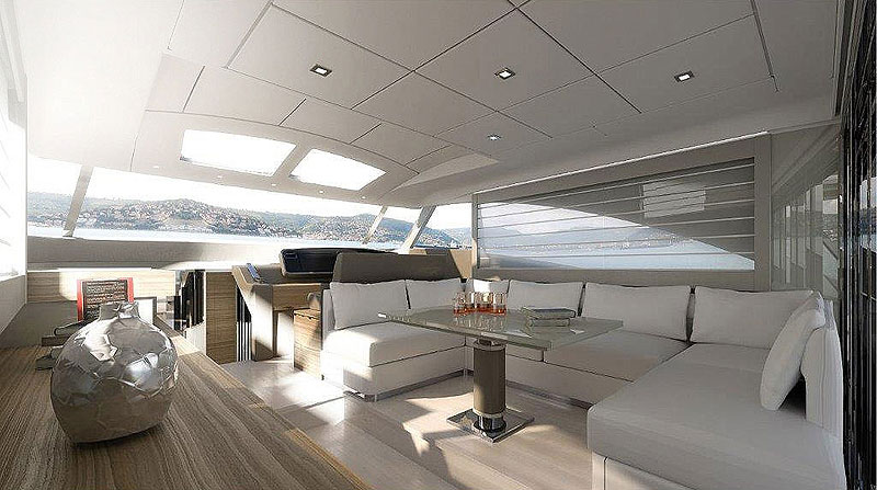 Проход в салон из кокпита разделен сдвижной стеклянной дверью и окном, которые можно открыть, объединив обе зоны в большое пространство для отдыха. В салоне расположились огромный диван со складным обеденным столом, выдвижной телевизор и пост капитана.