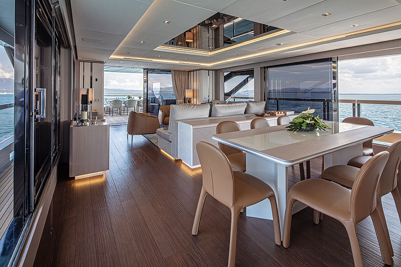 Поднимаясь на борт, мы оказываемся в огромном кормовом кокпите с обеденным столом, установленном под открытым небом над пляжным клубом. Кокпит и главный салон с внутренней обеденной зоной и кают-компанией кажутся единым пространством. Их разделяют только раздвижные стеклянные стены, фирменная черта интерьеров Mangusta.