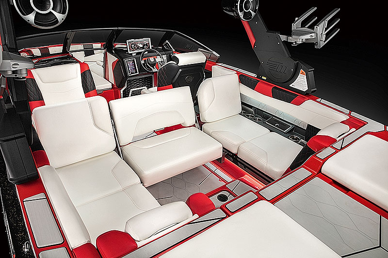 В кокпите установлен диван-трансформер Malibu Multi View Wake Bench, который за секунды меняет положение cпинки или легко превращается в обеденный столик. Все сиденья покрыты высококачественным морским винилом с ромбовидной вышивкой.