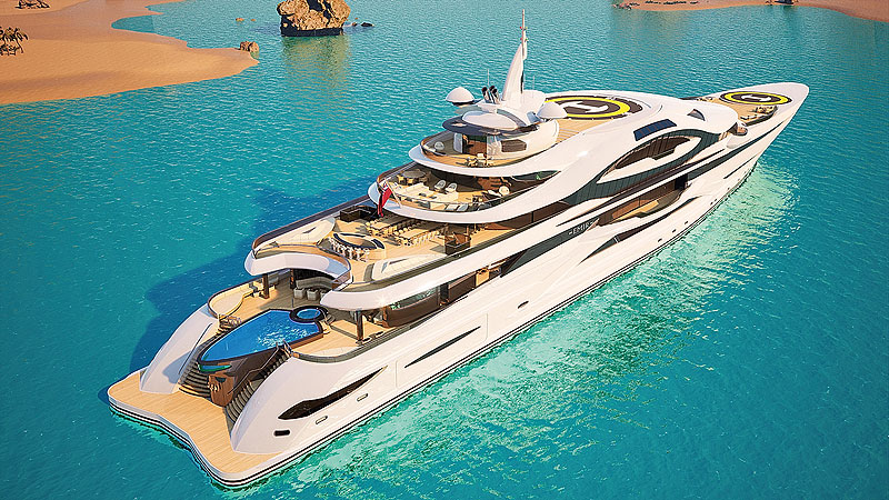 Изгибы этой мегаяхты похожи на причудливый орнамент... Вероятно, британская студия Gresham Yacht Design задумывала свой новый концепт в расчете на интерес клиентов с Ближнего Востока. Название Emir на рендерах написано по-арабски, а роскошь просто кричит в мегафон. К примеру, под вертолетную площадку отведен верхний ярус надстройки. Рядом с ней находится вестибюль, через который гости смогут спуститься на застекленном лифте в главный салон или на нижнюю палубу – к своим каютам. Вторая вертолетная площадка размещена в носовой части верхней палубы. Главный салон студия описывает как двухъярусный «бальный зал» с полностью застекленными стенами и опоясывающей его внутреннее пространство галереей, имеющей два выхода на боковые балконы. Мастер-каюта также с двумя балконами, личный салон владельца и бассейн расположены на отдельной палубе. Большой бассейн с застекленной передней стенкой парит над купальной платформой. На борту размещена станция переработки отходов и система очистки сточных вод, на 9/10 сокращающие вредные выбросы.
