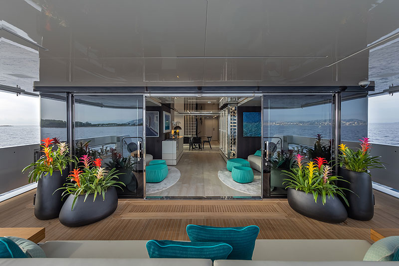 Планировка яхты рассчитана на двенадцать пассажиров и шесть членов экипажа. «Максимальный контакт с морем» был указан в брифе, поэтому в главном салоне большие окна и раздвижные стеклянные двери.